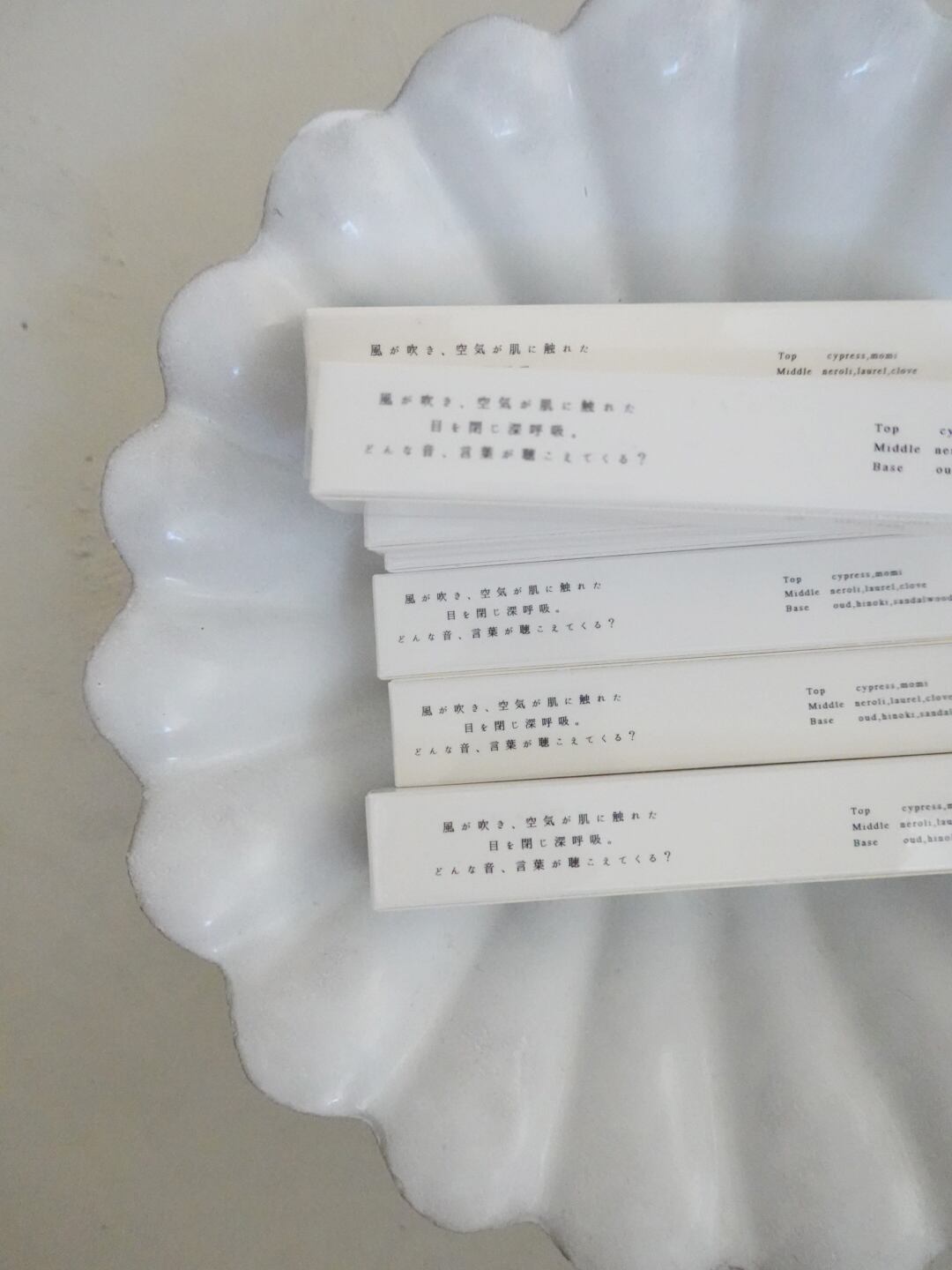 ギャラリーのイメージでオリジナルで香りを調香してもらいました。ほっと安心もするし、シャキッと背筋の伸びるやる気ももらえるイメージで作ってもらっています。生きていく中でもちろんそのままで大丈夫、生きてるだけで最高、何をしてもしなくてもいいということは自分自身感じて生きたいなと思いますが、それに加えて、ここからもっとこうなりたい!こんなことがしたい!新しいやったことないことにチャレンジしていく!成長していくこともとても大事だと思っているので。両方感じられる香りにしていただきました。ぜひ、ご自宅でもギャラリーの空間にいる感覚を感じていただければ幸いです。